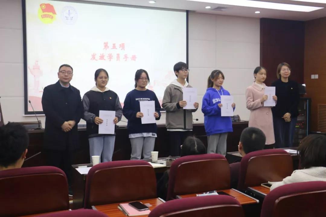 校团委副书记曹智和pp电子平台官网入口党支部(直属)副书记杨涛为学员代表发放了学员手册。