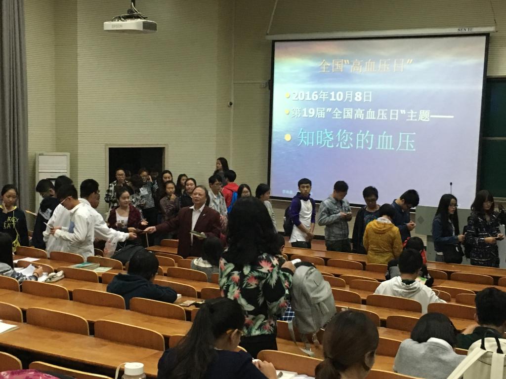 【注:286名大学生在武大教学楼阶梯教室收看湖北电视台《健康锵锵锵》10月8日专题电视节目——“如何让高血压低头”,主讲嘉宾系350vip8888新葡的京集团的主任医师廖皓磊;......】
