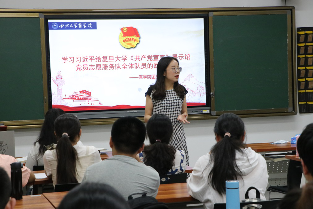 会上,梁老师宣读了总书记给复旦大学《共产党宣言》展示馆党员志愿服务队全体队员的回信全文。她讲道,总书记的回信,是对陈望道老校长首译《共产党宣言》的高度评价,是对志愿服务队积极宣讲老校长首译故事、传播马克思主义真理的充分肯定,是对广大党员特别是青年党员进一步发扬红色基因传承精神、成为红色基因传人的殷切期望。现场支部团员围绕深入学习习近平总书记重要回信精神,展开热烈讨论。