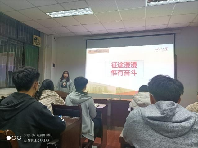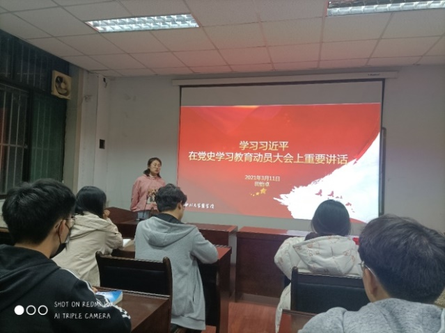 团支部(直属)副书记(学生兼职)戴钰文紧跟时事热点,和团小组成员共同学习了2021年全国两会精神;优秀团员代表牛怡诺领学习近平总书记在全国脱贫攻坚总结表彰大会上的重要讲话精神;优秀团员代表田怡卓从学习意义、重点内容和具体要求三个方面与团员青年共同学习了习近平总书记在党史学习教育动员大会上的重要讲话精神;优秀团员代表成吉思雨结合党史教育,从“为什么中国共产党能带领中华民族走向伟大复兴”这一问题出发,阐释党在长期奋斗历程中形成和发展起来的理论优势、政治优势、组织优势、制度优势和密切联系群众的优势。