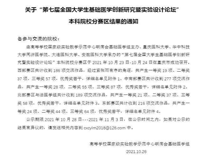 “第七届全国大学生基础医学创新研究暨实验设计论坛”本科院校分赛区于2021年10月23日–10月24日成功召开,学院选派四支队伍参加比赛,其中两支队伍荣获西部赛区一等奖,两支队伍荣获三等奖。