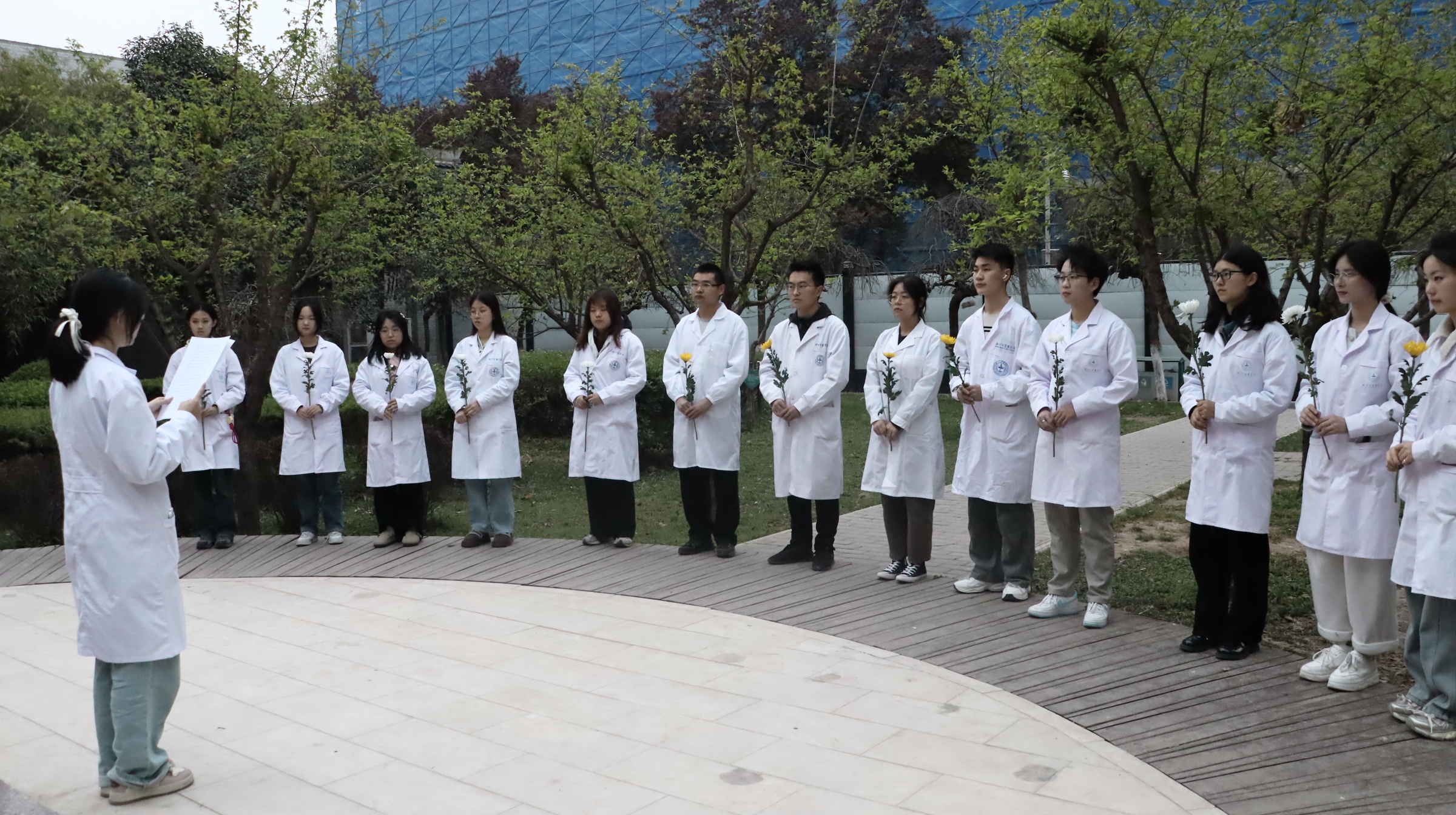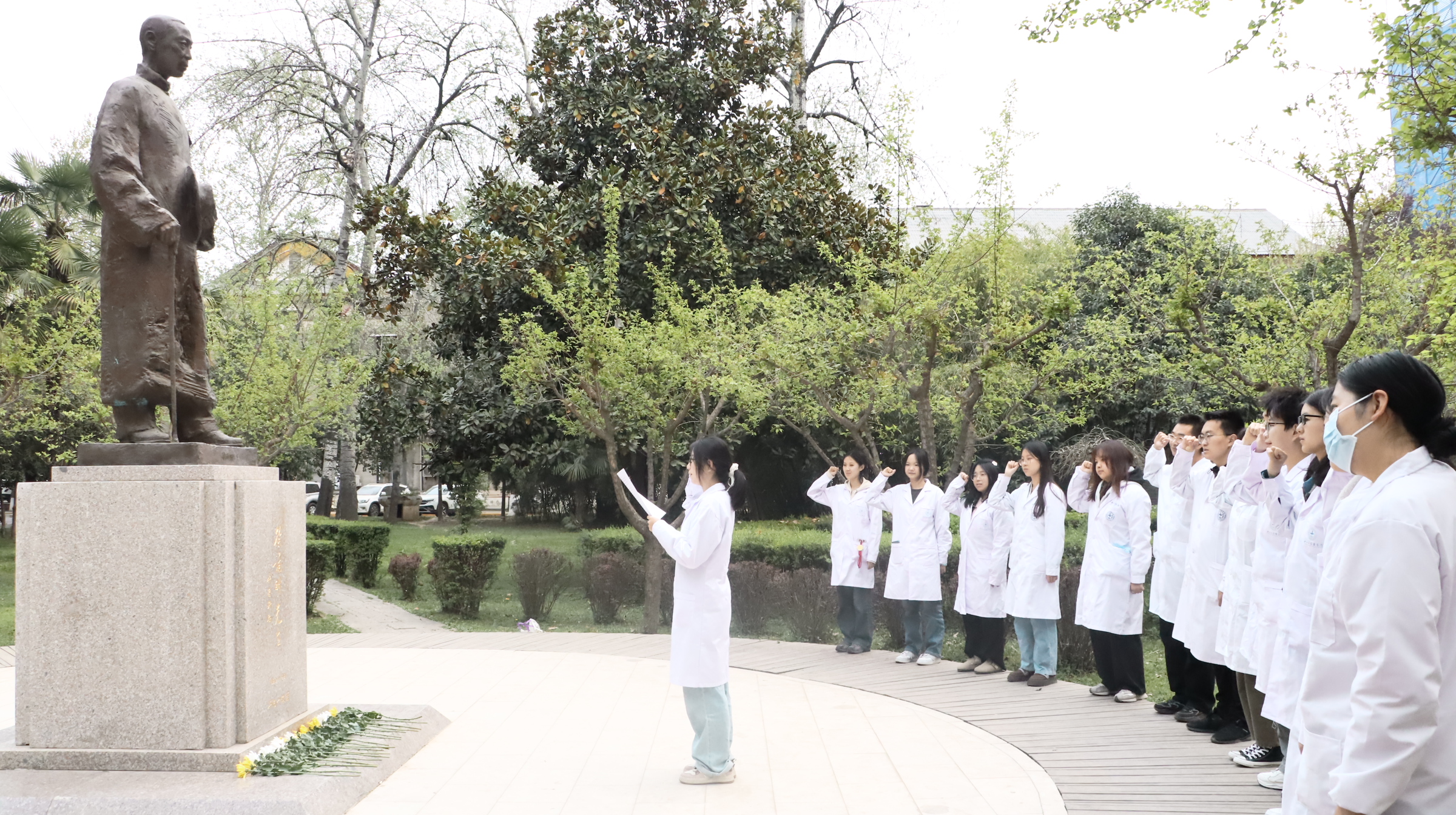 活动现场素花环绕,徐诵明先生的全身雕像肃然矗立。仪式在庄重的氛围中开始。师生代表缓步上前,向雕像献花并致敬,表达对先贤的追念。学生代表带领现场师生回顾了徐诵明先生作为中国现代医学教育开拓者的毕生追求,强调其“教育救国、医学报国”的信念对当代医学人才培养的深刻启示,以徐诵明先生抗战时期临危受命、重建西北pp电子平台官网入口的事迹为例,勉励师生“将爱国情怀融入医学实践,以仁心仁术守护人民健康”。全体师生高举右拳重温《医学生誓言》,“健康所系,性命相托”的铿锵誓言在校园久久回响。