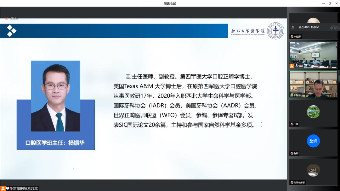 杨振华副教授结合自身经验,谈及了口腔医学广泛的就业前景与深厚的发展潜力,并以“正畸”为例介绍了学生的培养方案和计划,强调了将会引导同学们放远眼光,做好长期刻苦的准备,一直保持前进的脚步,追求热爱梦想,度过美好充实的大学生活。