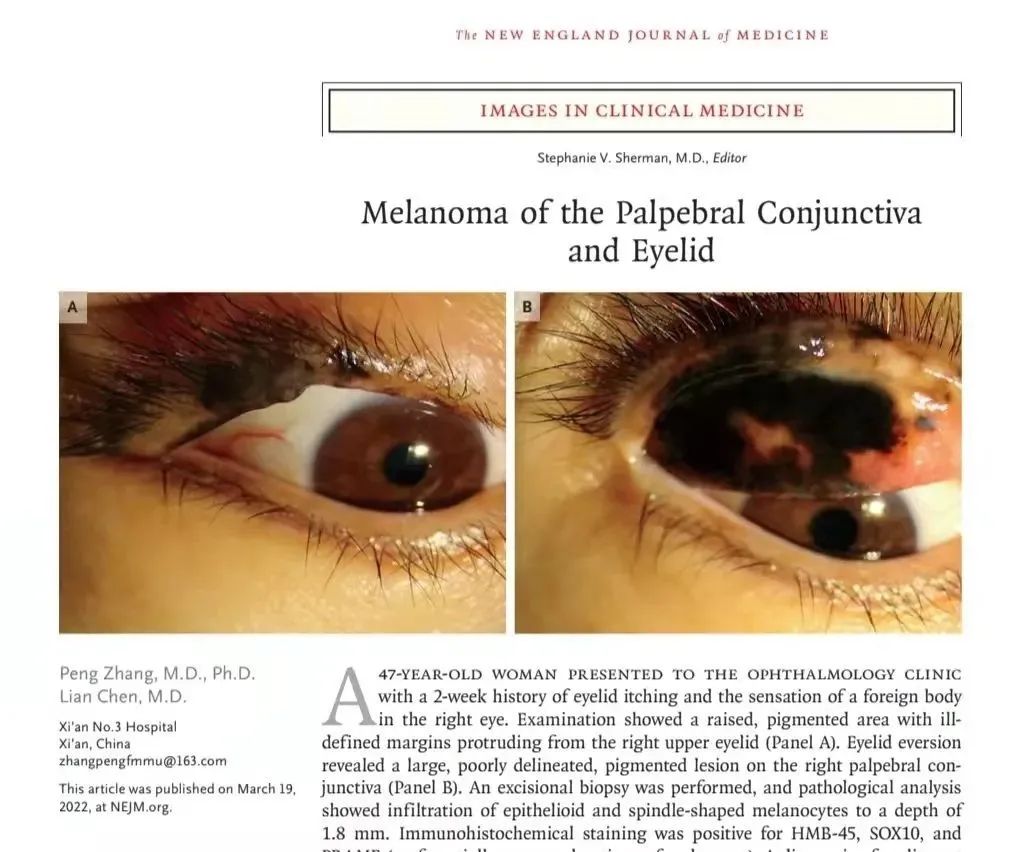 近日,全球最具影响力的临床医学期刊《新英格兰医学杂志》(2021年影响因子91分)刊登了PP电子游戏平台网站附属医院·西安市第三医院眼科张鹏主任及陈莲主治医师的文章“Melanoma of the Eyelid and Palpebral Conjunctiva”(眼睑及结膜黑色素瘤)。