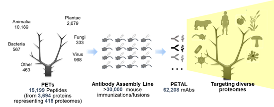 抗体作为一类重要的生物亲和试剂,在生命科学研究和医学相关研究中不可或缺。在高通量核酸测序技术的强大测序能力的推动下,目前已有大量物种的基因组被完全测序。针对这些物种,需要大量的抗体来推动后续研究。但常规抗体制备技术费时,费力且耗费不菲,一般一次只能制备一种抗体,无法满足在较短的时间内获得大量抗体的迫切需求。针对上述需求,本文开发了一款包含62,208种单克隆抗体的超高通量抗体芯片,并利用抗体的多特异性(multi-specificity)去发现和寻找新抗体。该芯片被成功验证可用于快速蛋白抗体制备、蛋白质组水平的抗体组制备、表型相关蛋白质筛选以及肿瘤药物靶向蛋白的发现等多种不同目的应用。这些单克隆抗体的免疫原来自400+类物种的3,000+种蛋白质的15,000+个线性表位,通过上万只小鼠的免疫、骨髓瘤细胞融合和筛选,最终形成了一个具有高度多样性,包含62,208种单克隆抗体的超大容量抗体库(图1)。