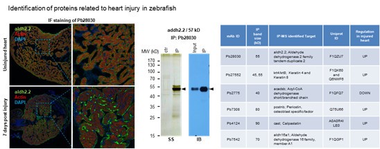 PETAL在蛋白组抗体开发应用上成功也进而指出了PETAL可应用于物种表型/功能相关的蛋白与抗体发现,通过比较特定表型与对照之间的芯片信号差异以获得抗体,并采用相同的方法鉴定抗原。研究人员以“玉米籽粒发育”和“斑马鱼心脏再生”为代表成功地鉴定了19个与玉米发育相关的蛋白质,以及6个与斑马鱼心脏损伤相关(图3)的蛋白质。这种技术的优势在于可在鉴定到关键蛋白的同时获得高质量的单克隆抗体,用以后续的验证和功能实验。