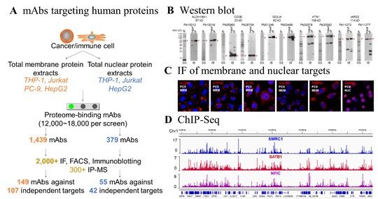 实验中研究人员为了证明抗体芯片的广泛应用性,首先用81个人与大肠杆菌随机来源的蛋白对PETAL芯片进行了筛选,证明了PETAL可以在较短的时间内(1-2周)以至少20%的成功率获得随机蛋白的高亲和力识别抗体。这也意味着对类似人这样含1万种以上蛋白的蛋白质组,PETAL有可能实现几千种蛋白的识别覆盖。为验证PETAL在蛋白组抗体开发上的可能性,研究人员提取几种人细胞系的膜蛋白组和核蛋白组,批量地筛选得到了149个膜蛋白单抗和55个核蛋白单抗,随后对这些抗体进行了严格的特异性评估并且证明筛选得到的单抗可适用于IF、ChIP-seq等多种应用(图2)。同时,研究人员也已经在超过10个物种(涵盖了病毒、细菌、真菌、植物、动物)上成功验证了PETAL可用于批量开发这些物种特异的应用抗体,因而PETAL有望为目前缺少抗体研究工具的多个物种提供一个批量抗体开发的解决方案。