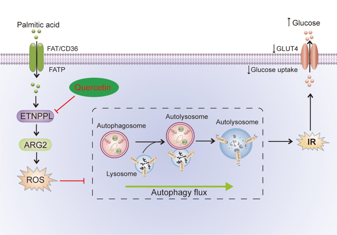 )会引起肝细胞中ETNPPL基因表达水平显著升高,ETNPPL通过进一步上调线粒体基因精氨酸酶2(ARG2)的表达促使肝细胞活性氧(reactive oxygen species, ROS)的过量产生和氧化应激压力(oxidative stress),从而抑制肝细胞的自噬通量,最终触发了肝细胞的胰岛素抵抗(insulin resistance,IR)。研究最后还发现,中药单体槲皮素可以通过靶向ETNPPL可以显著改善PA引起的肝细胞胰岛素抵抗。该研究为阐明肥胖相关的肝脏胰岛素抵抗的发病机制提供了新的见解,为治疗肥胖相关2型糖尿病(T2DM)提供新的治疗策略。