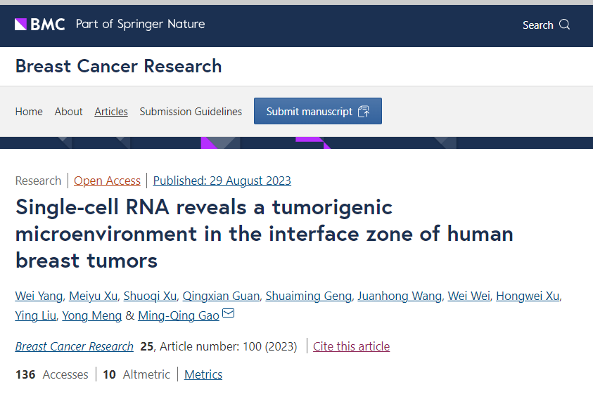 近日,pp电子平台官网入口高明清教授课题组在中科院一区TOP期刊《Breast Cancer Research》发表了题为“Single-cell RNA reveals a tumorigenic microenvironment in the interface zone of human breast tumors”的研究论文。生命科学学院博士研究生杨威为该论文的第一作者,高明清教授为通讯作者。