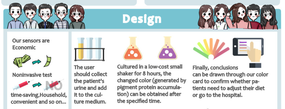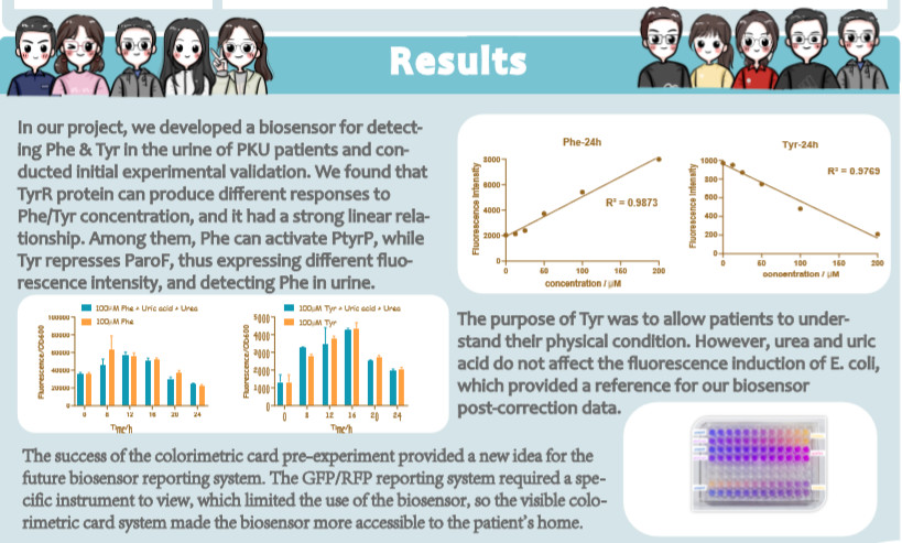 我校参赛项目是利用合成生物学技术对患者尿液中苯丙氨酸和酪氨酸的微生物检测,实现家用型苯丙酮尿症监控器。苯丙酮尿症(phenylketonuria,PKU)是一种常见的染色体缺陷导致的氨基酸代谢病,是由于苯丙氨酸(Phe)代谢途径中的酶缺陷,使得苯丙氨酸不能转变成为酪氨酸(Tyr)。PKU在现阶段尚没有治愈方式,只能通过控制饮食,维持身体健康,含陕西省在内的我国北方地区为PKU的高发区域。本项目从实际问题出发,采用合成生物学的设计理念,把调控苯丙氨酸和酪氨酸合成相关色素蛋白等基因导入基因工程菌,研究苯丙氨酸、酪氨酸与色素蛋白表达量的关系,并探析了尿液中尿素和尿酸对细菌生长的影响,同时构建了与实验相互对照的细胞传感器数学模型,为进一步研制家用苯丙酮尿症传感器奠定了理论基础,使患者可以足不出户,在家中检测自己的身体情况。