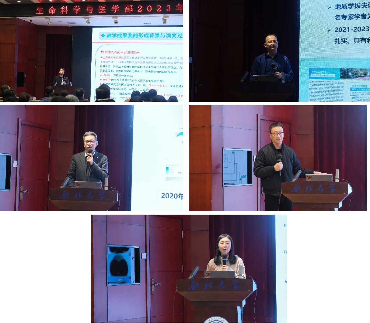 特邀报告环节,谢寿安教授结合自身工作经历,分享了“国家级教学成果奖的凝练与申报”教学经验和心得体会;张志飞教授结合地质学系学科建设,分享了国家一流学科建设的经验和心得体会;樊海明教授、贾贤卿教授分别从各自团队的研究工作入手,分享了科研成果;田静教授从新药研发平台建设的工作入手,分享了科技成果转化的经验和心得体会。