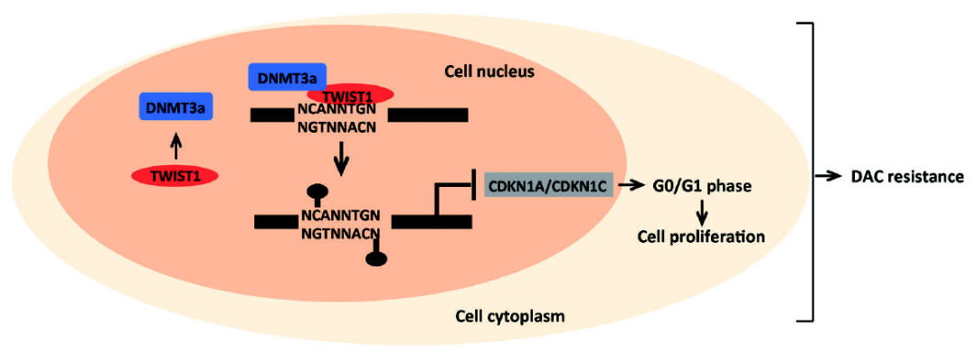 李想教授团队通过分析临床样本,发现地西他滨耐药的MDS/AML病人血液细胞中TWIST1的表达、基因组甲基化水平以及甲基转移酶DNMT3a的表达显著高于地西他滨敏感的MDS/AML病人。 体内和体外实验的功能学实验证明,过表达TWIST1能够增强MDS/AML细胞对地西他滨的耐药,而敲减TWIST1可以增强细胞对地西他滨的敏感程度。 进一步通过液相色谱-质谱联用技术发现TWIST1可以与DNMT3a相互作用,利用多肽阵列芯片鉴定出TWIST1上与DNMT3a互作的关键位点,发现封闭该位点可以有效减弱细胞对地西他滨的耐受性。 通过基因组甲基化芯片发现过表达TWIST1后细胞周期依赖性激酶抑制因子CDKN1A及CDKN1C的启动子区甲基化水平显著升高,影响基因表达,从而影响细胞周期,使细胞产生耐药(图1)。