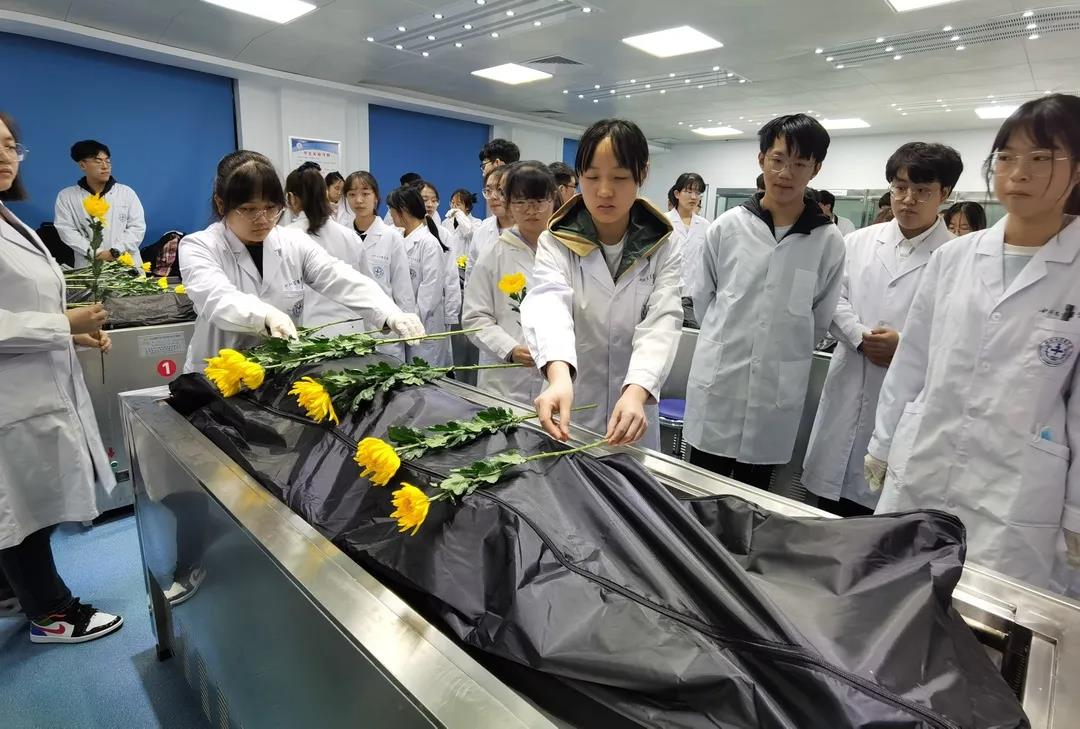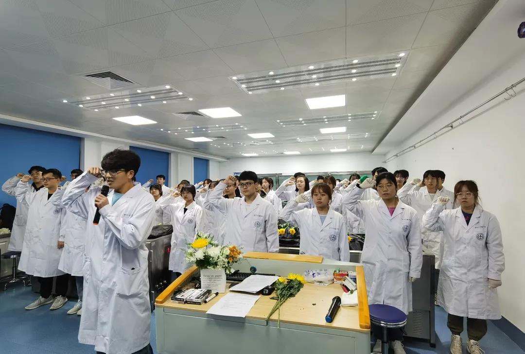 仪式中,2020级全体本科生庄严诵读誓词“无言良师,授吾医理;敬若先贤,临如活体;谨言躬行,追深辨细;德彰术精,锤成大医。”同学们轮流依次向大体老师献花,并默哀、签名致敬。