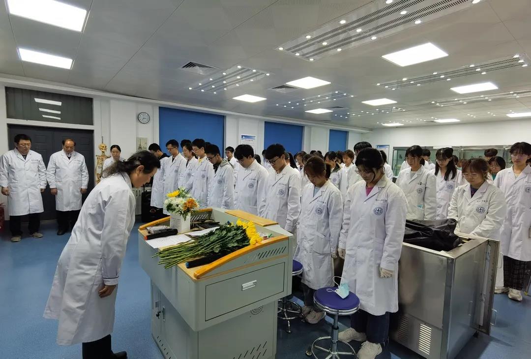 李金莲教授讲解了“大体老师”的由来、遗体捐献的价值和意义。她讲到,“大体老师”是知识的承载者和给予者,是厚道精神的传承者,是时代价值观念和道德标准的塑造者。每一位无语良师都有自己的故事,我们也许无法知道他曾经经历了什么,但是每一个遗体捐献志愿者都有一颗奉献之心,他们将这一颗滚烫的心灵交付给祖国医学的未来。