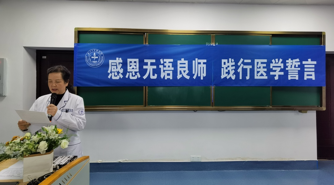 学生代表梁馨瑶讲到,课堂上的无言良师让我们心生感恩与崇敬之情,让我们感受到了那份沉甸甸的责任与使命。我们将如誓言中所说:决心竭尽全力除人类之病痛,助健康之完美,维护医术的圣洁和荣誉,救死扶伤,不辞艰辛,执着追求,为祖国医药卫生事业的发展和人类身心健康奋斗终生。