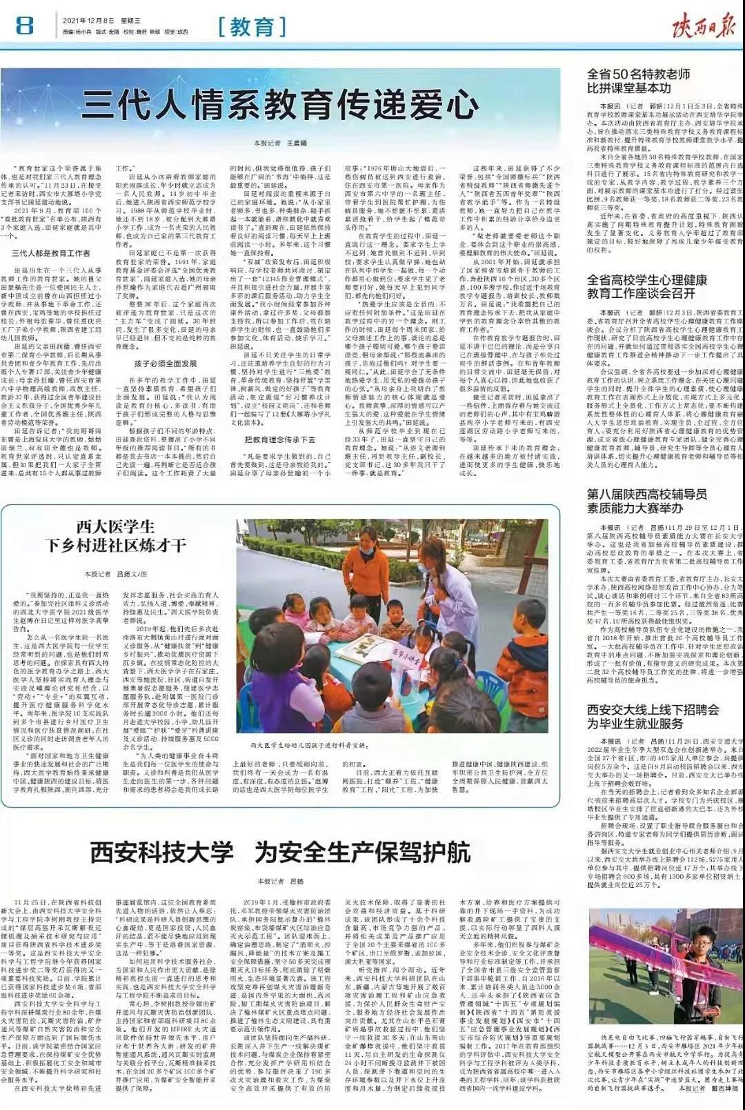 12月8日,陕西日报发表题为《西大医学生下乡村进社区炼才干》的报道,对西大医学学子积极开展乡村义诊、惠民服务、医学科普、志愿导诊等志愿服务活动进行专题报道。