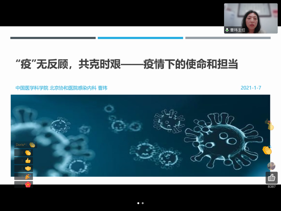 1月7日晚,PP电子游戏平台网站医学战“疫”大讲堂在腾讯会议端开讲,北京协和医院感染内科副主任、2020年初国家援鄂抗疫医疗队队员曹玮医生做客讲堂,作题为——“‘疫’无反顾,共克时艰,疫情当下我们的使命与担当”分享报告,全校师生在线观看。讲堂由生命科学与医学部主办,校党委副书记张清主持。