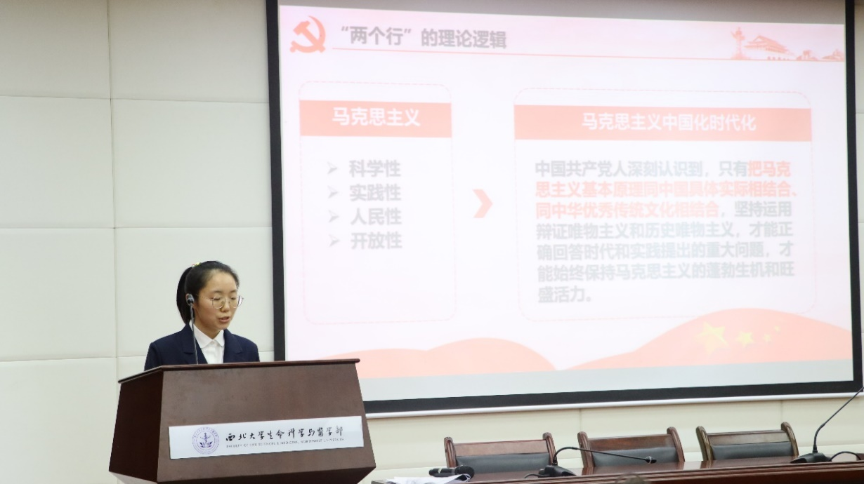 全体学员重温入团誓词并奏唱团歌。青年先锋宣讲团的两位同学为青马班全体学员带来了本期青马班开班第一讲。pp电子平台官网入口2021级本科生胡玉洁以“在‘两个结合’中不断谱写马克思主义中国化时代化新篇章”为题为全体学员讲授专题团课,她从“两个结合”的提出、内涵和意义三个方面入手,深入系统地解读了马克思主义中国化时代化的进程,阐述了“两个结合”在新时代的意义及其对青年团员的启迪和引领作用。最后,胡玉洁呼吁青年们要以思想的力量激扬奋进,以理论的主动把握历史的主动,在“两个结合”中不断书写马克思主义中国化时代化的新篇章。