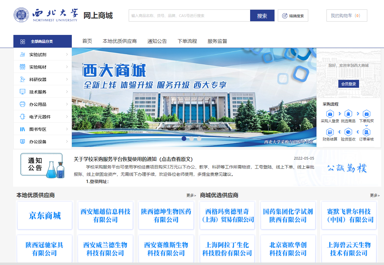学校采购服务平台——西大商城是为西大教职工量身定制,服务于教职工购买3万元以下实验试剂、实验耗材、办公用品、办公家具、图书、电子元器件等物资。